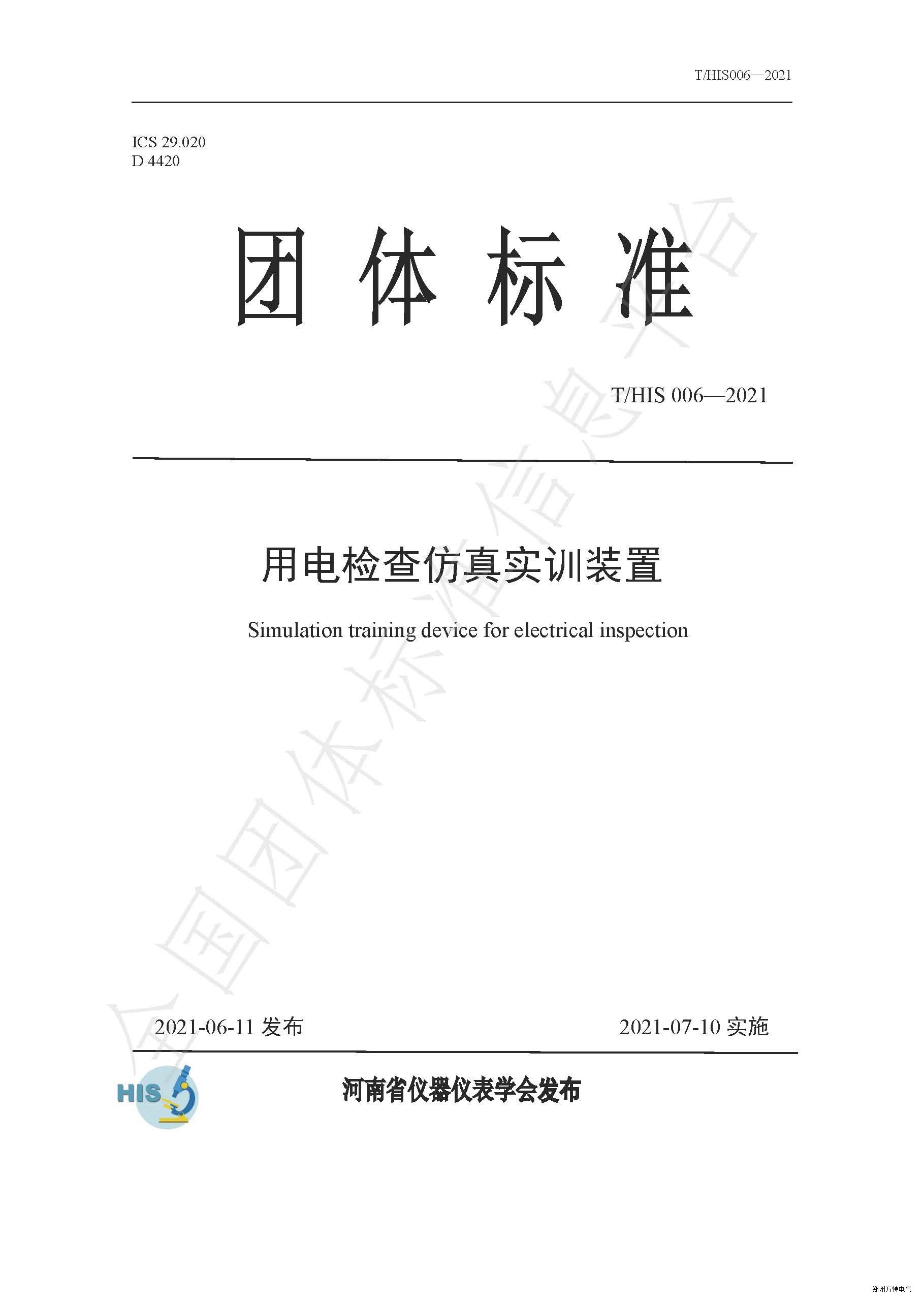 近日,由万特电气制定的河南省仪器仪表学会团体标准《用电检查仿真实训装置》T/HIS 006,于2021年6月11日发布,将于2021年7月10日实施。