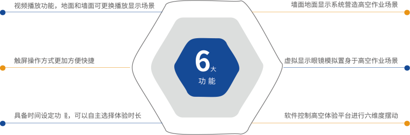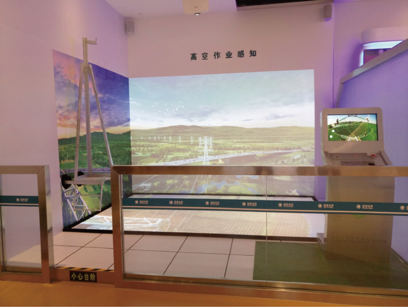 该项目让学员亲身体验在高空铁塔上作业时,由于风力的影响人员在铁塔上摆动的感觉,在室内搭建铁塔的一 角供体验人员站立,高度为0.5米,采用VR 技术佩戴体验式头盔打造的具有沉浸式体验感觉的新型体验模式。体 验人员仿佛置身于几十米高的铁塔上,能够亲身体会高空作业的眩晕感,身临其境的体验高空作业情形,锻炼 学员的适应能力,提高高空作业安全防护技能。